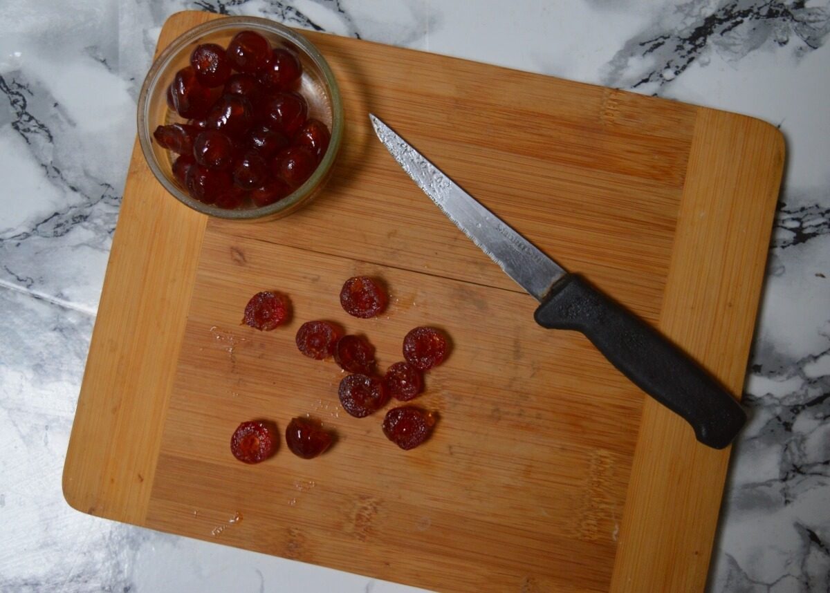 - Chop the cherries, into halves or quarters, depending which you prefer