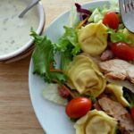 In a big bowl mix together the mixed salad, cherry tomatoes, pasta, chicken and bacon