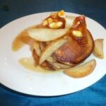Place on a warm plate while the pears are prepared.