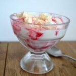 Whip the double cream and spoon into bowls. Stir through some raspberry sauce and sprinkle some crushed meringues on the top.