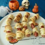 Wrap a strip of pastry around the top and bottom of each hot dog leaving a gap for the face.
