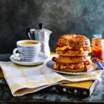 Place the bagel halves side by side slightly separated and carefully line the holes with a slice of Parma ham.