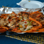 Peel and chop the garlic and onion and sprinkle on the baking tray.